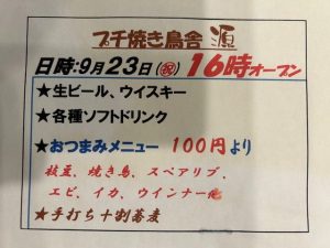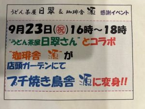 本日、9月23日(㊗) 16時から 珈琲舎 源がプチ焼き鳥舎 源に変身します